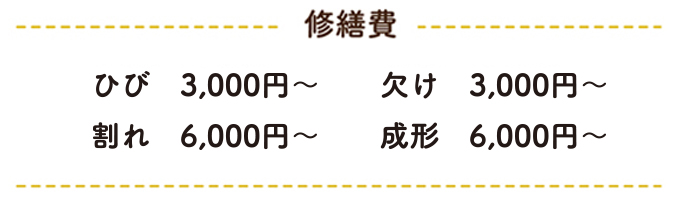 修繕費は器の大きさや状態、仕上げ方(金、銀、錫、真鍮の金属粉または色漆)によって値段が変わります。